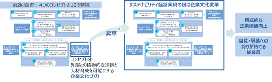 その結果を「4つのコンセプト、10の特徴」から検証すると残念ながらサステナビリティ経営への取り組みの停滞感が見えてきています。ただし、その中でも4つのコンセプトの中の「外部との積極的な連携と人材育成を可能にする企業文化づくり」がこの範疇にとどまらず企業のサステナビリティ経営実現のための重要なポイントとして昇華していることがうかがえました。特に先進企業では「戦略・仕組みづくり」と同時並行して「企業文化変革」に取り組むことがサステナビリティ経営の推進・実現のポイントとなっています。