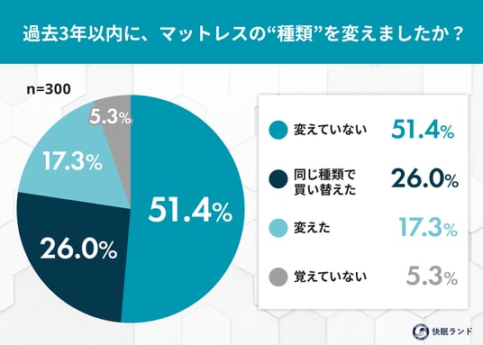 - 過去3年以内にマットレスの種類を変えていない人が半数超