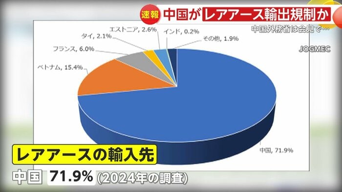 日本の独立行政法人の調査によると、2024年のレアアースの輸入先に占める中国の割合は71.9%で、輸入の大半を中国に依存している。