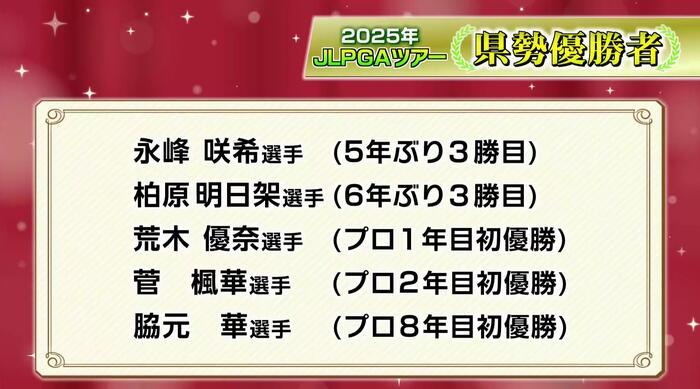 2025年シーズンは、菅プロだけでなく、宮崎県ゆかりの選手が大活躍したシーズンでもあった。ツアー最終戦「リコーカップ」には、永峰咲希プロ、柏原明日架プロ、荒木優奈プロ、脇元華プロ、そして菅楓華プロの計5人が出場。