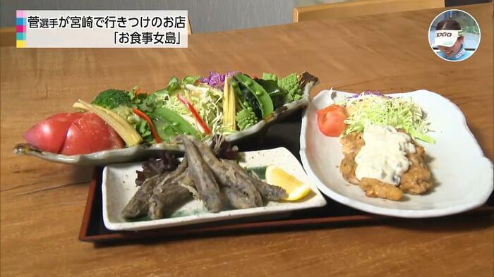 菅プロがいつも食べているのが、宮崎名物の「チキン南蛮」「メヒカリの唐揚げ」「野菜サラダ」のセット。さらに、締めには必ず、細い麺面が特徴の「五島うどん」を頼むそうだ。