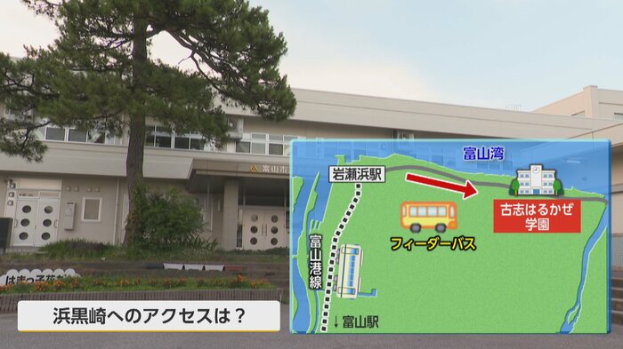 校舎は再編統合により閉校する浜黒崎小学校を活用するため、岩瀬浜駅から路線バスを使うか保護者の送迎が必要になる。