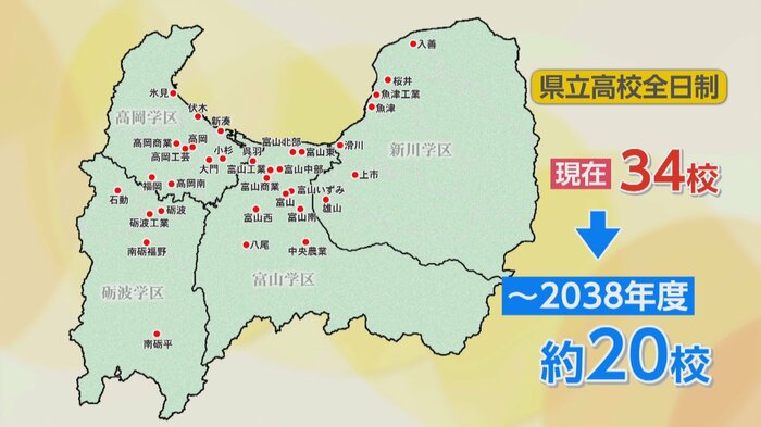 県教育委員会はおととし、現在34ある全日制の高校を2038年度までに20校程度に集約する方針を打ち出した。今年度の議論では、再編統合は2029年度、2033年度、2038年度の3期に分けて進めること、そして大規模校を1校のみ新設する方針としている。