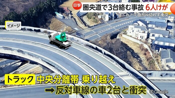警視庁によると、トラックがカーブを曲がりきれずに中央分離帯を乗り越え、反対車線を走っていた車2台と衝突したという。
