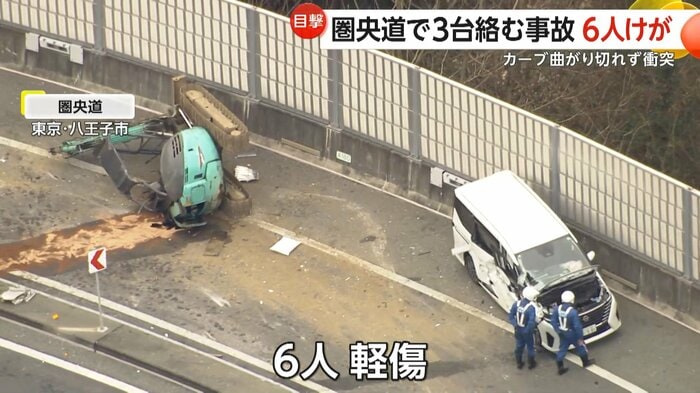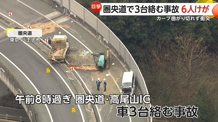 東京・八王子市の圏央道で7日、車3台が絡む衝突事故が起きた。トラックが中央分離帯を乗り越え、反対車線を走行していた乗用車2台と次々に衝突。あわせて6人がけがをした。