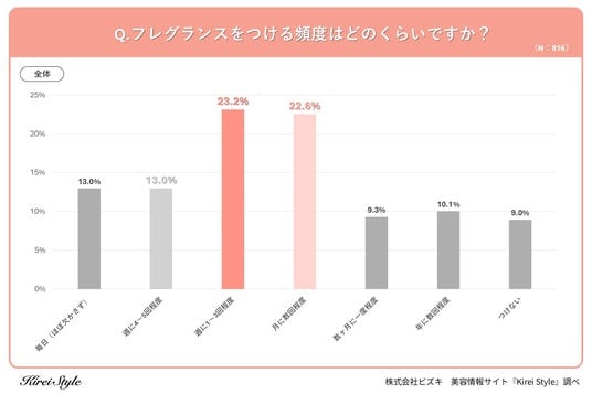 「キレイスタイルで、今日の私をアップデート」をコンセプトに、美容や健康にまつわる情報を発信する「Kirei Style(キレイスタイル)」の運用を行う株式会社ビズキは、事前調査で「フレグランスを1個以上所有している」と回答した全国の女性816人を対象にフレグランスに関するアンケートを実施し、年代別等の特徴についてまとめました。