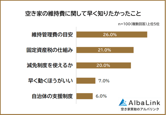 株式会社AlbaLink(本社:東京都江東区、代表取締役:河田 憲二)は、空き家を所有したことがある100人を対象に「空き家の維持費に関する意識調査」を実施し、そのデータをランキングにしました。