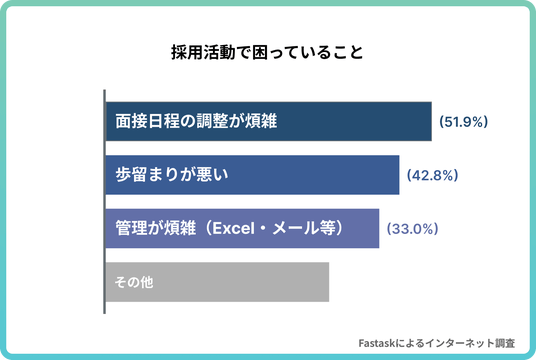 また、「採用活動で困っていること」を尋ねた設問では、「面接日程の調整が煩雑」が51.9%で最多となりました。応募数や内定辞退といった課題よりも、日程調整そのものが採用活動の大きな負担になっていることがうかがえます。