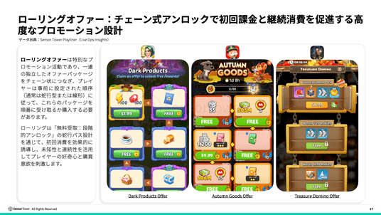 ローリングオファーは特別なプロモーション活動であり、一連の独立したオファーパッケージをチェーン状につなぎ、プレイヤーは事前に設定された順序(通常は蛇行型または線形)に従って、これらのパッケージを順番に受け取るか購入する必要があります。「無料受取:段階的アンロック」の蛇行パス設計を通じて、初回消費を効果的に誘導し、未知性と連続性を活用してプレイヤーの好奇心と購買意欲を刺激します。