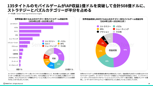 2025年には135タイトルのモバイルゲームがIAP収益1億ドルを突破し、その合計は508億ドルに達しました。ストラテジーは高課金プレイヤーと長いライフサイクルを原動力として、約150億ドルの収益を上げ、投資額とリターンが最も高いジャンルとなっています。パズルは幅広いユーザーベースと安定した課金コンバージョンを持ち、カジュアルカテゴリーが精緻なオペレーションを通じてトップクラスの商業的ポテンシャルを発揮できることを十分に示しています。