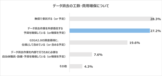 GIGAスクール端末の処分やデータ消去のための予算を確保できている教育委員会は27.2%と、半年前(28.8%)からほぼ横ばいで、データ消去を内部で行うために予算確保している(予定している)と合わせて34.8%。前回調査同様、約3分の1程度にとどまりました。適切な処分・データ消去ができない理由として「予算が確保できない」と回答した自治体も約1割存在します。外部委託を進めるには自治体内の予算措置に加え、国による支援を含め令和8年度、9年度予算での十分な財源確保が求められます。