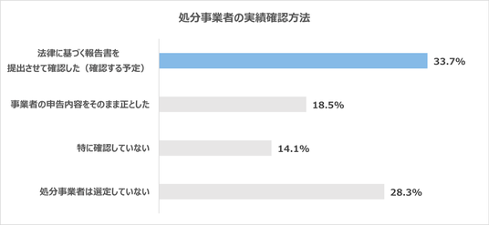 さらに、委託事業者の確認の際、法律に基づく認定書・認定計画を提出させている自治体は27.2%。さらに、約18%が事業者の実績申告をそのまま信用していたことが判明
