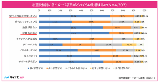志望校の検討に「強く影響する」イメージ項目について聞いたところ、最も強く影響があるのは「学べる内容が充実している」(67.6%)となった。次いで「就職力が高い」(67.1%)、「サポートが手厚い」(61.3%)となった。【図3】