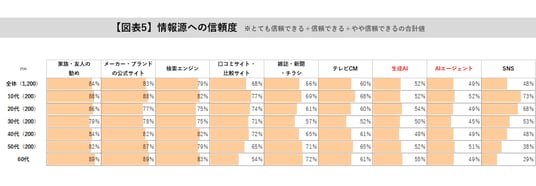 また、生成AI・AIエージェントを「とても信頼できる」「信頼できる」「やや信頼できる」と回答したのは全世代で約50%と、SNSと同程度の水準でした。テレビCMに次ぐ信頼度といえます。【図表5参照】