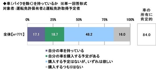 まず、運転免許保有者と取得予定者771名に、車(バイクを除く)を持っているかを聞いたところ、「自分の車を持っている」は17.1%、「自分の車を購入する予定がある」は18.7%、「購入する予定はないが、いずれは欲しい」は48.2%で、合計した『車の所有に肯定的』な方の割合は84.0%となりました。