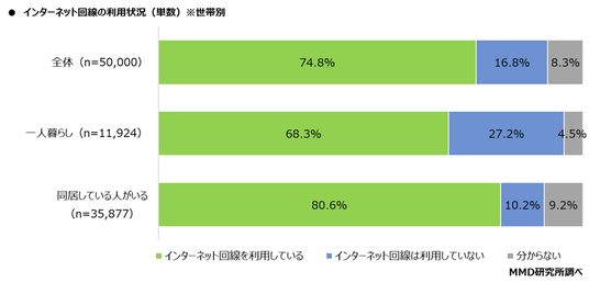 20歳~69歳の男女50,000人を対象に、自宅のインターネット回線の利用について聞いたところ、「インターネット回線を利用している」は74.8%となった。