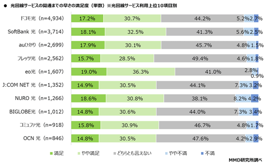 開通までの早さの満足(「満足」と「やや満足」の合算割合)は、eo光(n=1,607)が55.3%と最も多く、次いでSoftBank 光(n=3,714)が50.6%、NURO 光(n=1,266)が49.4%となった。