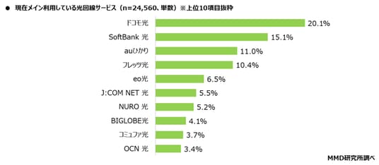 現在自宅で光回線を利用している24,560人を対象に、現在メイン利用している光回線サービスを聞いたところ、「ドコモ光」が20.1%と最も多く、次いで「SoftBank 光」が15.1%、「auひかり」が11.0%となった。