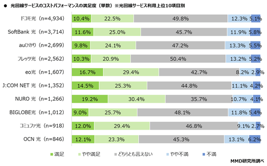 光回線サービス利用上位10項目を対象に、光回線サービスの項目別満足度を聞いたところ、コストパフォーマンスの満足(「満足」と「やや満足」の合算割合)は、NURO 光(n=1,266)が49.5%と最も多く、次いでeo光(n=1,607)が46.2%、コミュファ光(n=918)が41.4%となった。