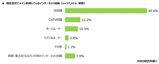 次に、インターネット回線を利用している37,414人を対象に、現在自宅でメイン利用しているインターネット回線を聞いたところ、「光回線」が65.6%と最も多く、次いで「CATV回線」が12.2%、「ホームルーター」が10.3%となった。