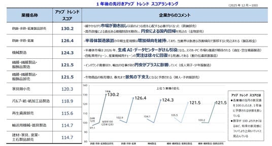 12月は、飲食関連や暖房機器、活発な年末商戦など季節商品が活発だった。また、観光産業では国内旅行が需要を押し上げ、さらにAI需要の拡大を受けて半導体や電気機械関連の生産も好調に推移した。他方、仕入単価の上昇や人手不足の継続はマイナス要因で、加えて長期金利の上昇も下押し材料となった。
