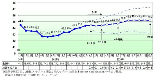 2025年12月の景気DIは前月比0.3ポイント増の44.4となり、2017年12月以来8年ぶりに7カ月連続で改善した。国内景気は、活発な季節需要や好調なAI関連が押し上げ要因となり、改善傾向が続いた。