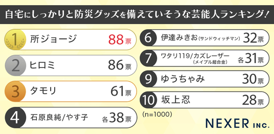 第3位の「タモリ」さんは、冷静で堅実な生活スタイルから、防災意識の高さを感じさせる存在として支持を集めました。
