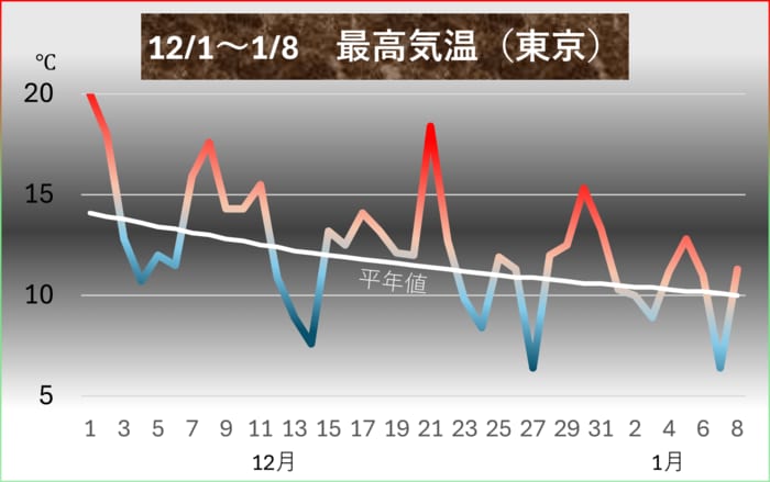 ただ、暖かい12月かというと、そうとも言えない。東京の最高気温と平年値をグラフに表してみると、寒暖差が大きいことが分かる。そして、注目点は寒い時期が長続きしていないということ。