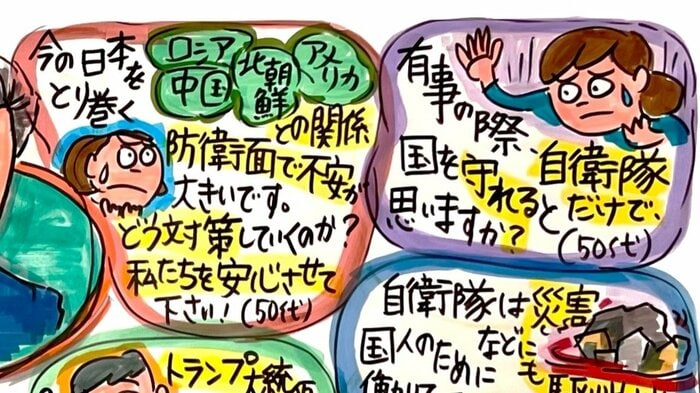 50代女性「今の日本を取り巻く中国や北朝鮮、ロシアとの関係やアメリカとの関係、防衛の面で不安が大きいのですがどう対策していくのか?私たちを安心させて下さい」