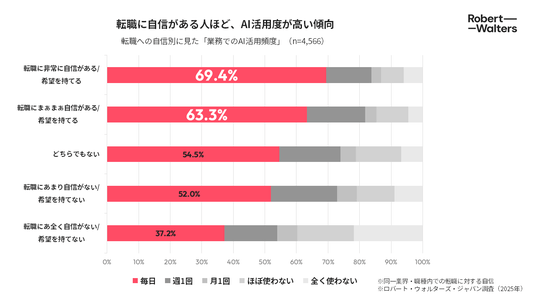さらに、日々の業務におけるAIの活用度合いと、業界・業種内での転職への自信の関係を分析したところ、転職に「非常に自信がある」「比較的自信がある」と回答した人ほど、AIの活用度が高い傾向があることが分かりました。