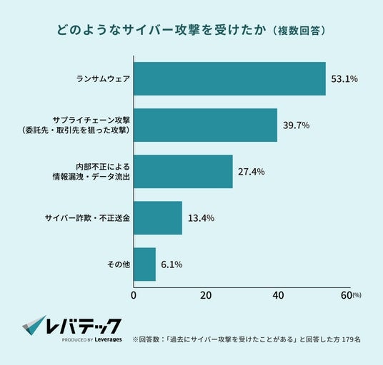 具体的な攻撃内容については、「ランサムウェア(53.1%)」が最多となり、次いで「サプライチェーン攻撃(39.7%)」「内部不正による情報漏洩・データ流出(27.4%)」と続きます。