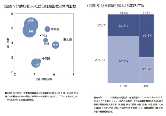 また、訪日経験回数が増えると、地方での宿泊数も増えることがわかっています(図表7)。さらに訪日回数4回以上のリピーターは訪問先をひとつの地域に絞り込む傾向が見られることから(図表8)、今後リピーター比率の増加が進むと、訪日外国人旅行者の周遊エリアは大都市から地方へシフトするとともに、絞り込みも進んでいくと考えられます。