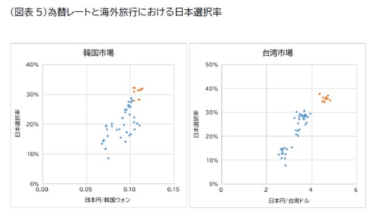 韓国、台湾については、コロナ禍後、海外旅行先として日本を選ぶ割合が大幅に上昇しています(図表5)。これらの日本に近い市場は為替レートの影響を受けやすく、日本選択率が高水準で推移している背景には、円安からくるお得感が挙げられます。