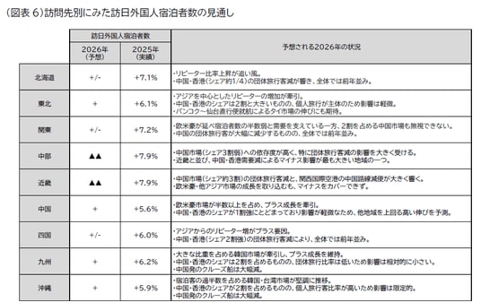 訪問先別に宿泊者数を見ると、訪日経験が豊富なリピーターが多い東北や、欧米豪からの旅行者比率が高い中国地方では、宿泊者数の増加が見込まれます。一方で、近畿や中部など、中国からの団体旅行客比率が高い地域では、前年を下回ると予測しています(図表6)。