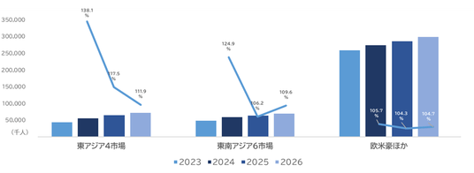 東南アジア6市場については、経済成長率では中国に近い水準であるものの、海外旅行者数の伸び率は9.6%増と一段下がる見通しです。これは、シンガポールのようにコロナ禍後の需要回復が早かった市場と、タイのように2026年に本格的な需要回復が進む市場が混在しているためです。