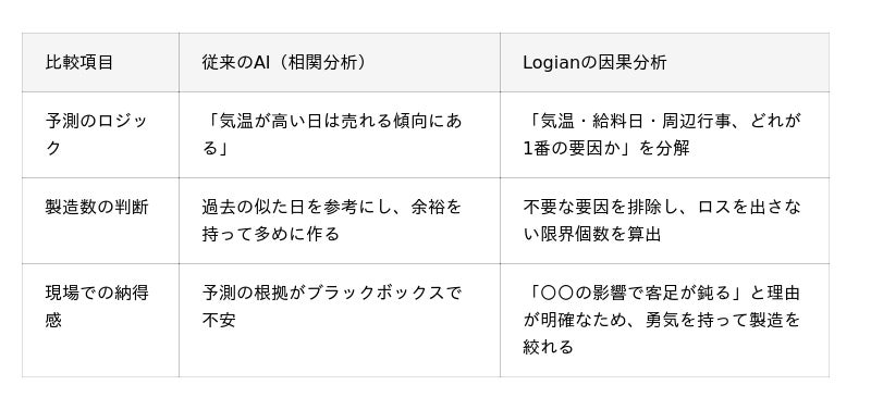 これまでの需要予測AIの多くは、データの連動性を見る「相関関係」に基づいたものでした。しかし、これでは「なぜその数字になったのか」が分からず、現場が自信を持って製造数を絞ることができません。本研究で導入する「因果分析」は、各要因が販売数に与える「影響度」を学術的に特定します。