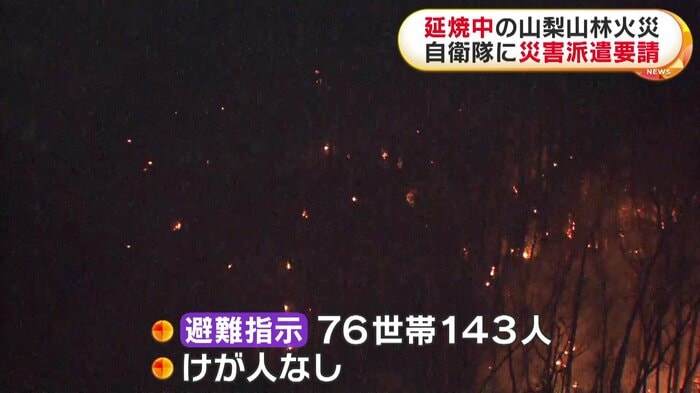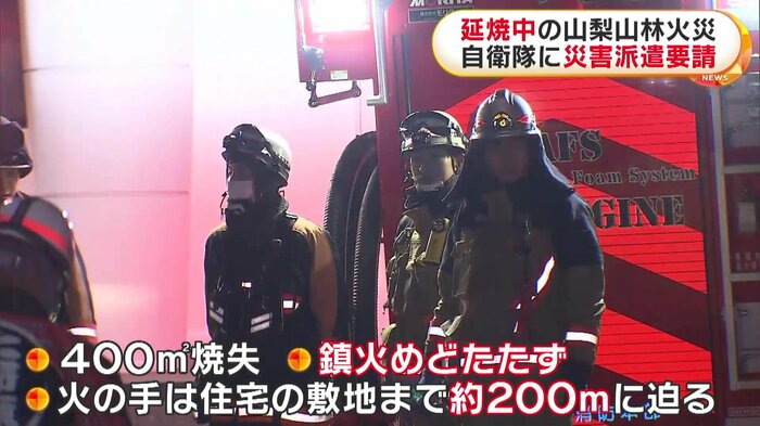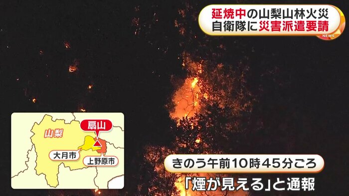 山梨県の山林火災は延焼が続いていて、県は自衛隊に災害派遣を要請、9日朝、消火活動が再開される。