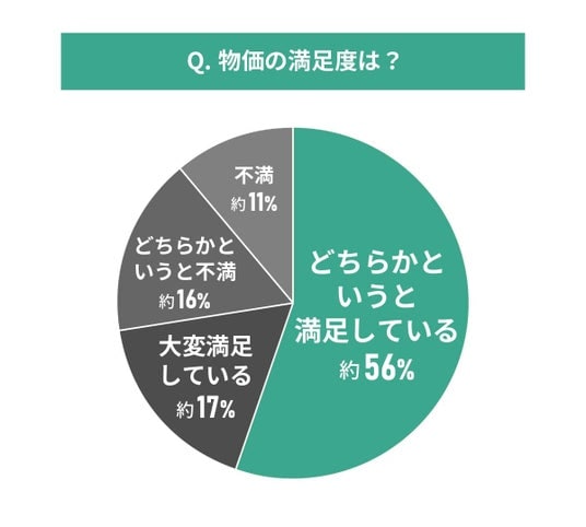 物価については約72%の住民が満足している一方で、約27%が不満を感じています。他の項目と比較すると不満の割合が高い結果となりました。