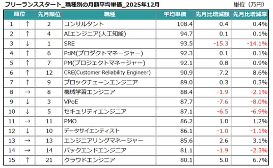 職種別の月額平均単価(上位15位)を見ると、高い専門性を持つ職種において順位の変動が見られました。なかでも「SRE」は93.5万円(-15.3万円/14.1%減)となり、9~11月にかけて首位を維持していた高水準から順位を下げ、数ヵ月前の水準へ回帰しています。一時的に高まっていた需要が落ち着き、体制や役割の見直しが進んでいることがうかがえます。