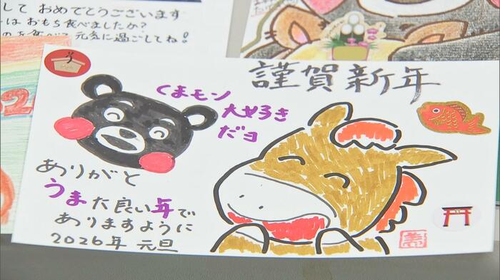 また、ことしもくまモンに国内外から多くの年賀状が届いた。干支の『午』とくまモンが描かれた色とりどりの年賀状。その数は、1月5日時点で3783通。全国47都道府県のほか、台湾やタイなど12の国や地域からも届いた。