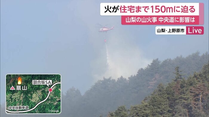 8日に発生した山梨県の山火事は、発生から24時間以上経った今も延焼が続いている。火は住宅までおよそ150メートルの地点に迫っていて、現在も消火活動が続いている。
