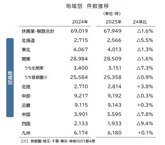 2025年に全国で休業・廃業、解散した企業は6万7949件となった。年間で最多だった前年(6万9019件)から1.6%減少し、3年ぶりに前年を下回ったものの、過去10年では2024年に次いで2番目に多い水準となった。