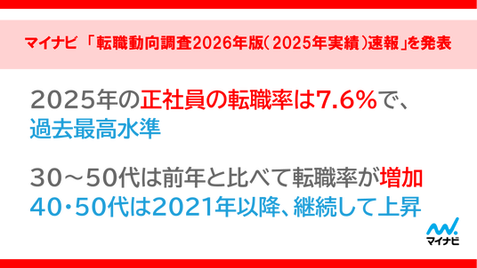 株式会社マイナビ(本社:東京都千代田区、代表取締役 社長執行役員:粟井俊介)は、全国の正社員で働く20~50代の男女2万人を対象に実施した「転職動向調査2026年版(2025年実績)速報」の結果を発表しました。