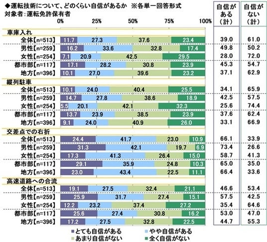 ◆「車庫入れに自信がない」61.0%、「縦列駐車に自信がない」65.9%、「交差点での右折に自信がない」33.9%、「高速道路への合流に自信がない」53.4%