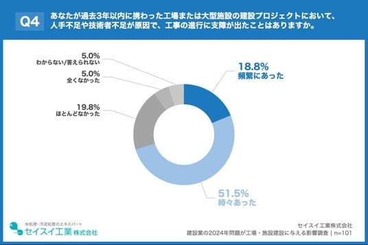 「Q4. あなたが過去3年以内に携わった工場または大型施設の建設プロジェクトにおいて、人手不足や技術者不足が原因で、工事の進行に支障が出たことはありますか。」(n=101)と質問したところ、「頻繁にあった」が18.8%、「時々あった」が51.5%という回答となりました。