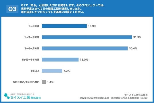 「Q3. Q1で「ある」と回答した方にお聞きします。そのプロジェクトでは、当初予定と比べてどの程度工期が延長しましたか。最も延長したプロジェクトを基準にお答えください。」(n=69)と質問したところ、「1~3ヶ月未満」が31.9%%、「3~6ヶ月未満」が30.4%という回答となりました。