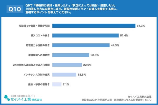 「Q10. Q9で「積極的に検討・提案したい」「状況によっては検討・提案したい」と回答した方にお聞きします。仮設水処理プラントの導入を検討する際に、重視するポイントを教えてください。(上位3つまで回答可)」(n=70)と質問したところ、「短期間での設置・稼働が可能」が64.3%、「導入コストの安さ」が51.4%、「処理能力や性能の高さ」が44.3%という回答となりました。
