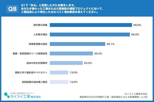 「Q8. Q1で「ある」と回答した方にお聞きします。あなたが携わった工場または大型施設の建設プロジェクトにおいて、工期延長により発生した主なコスト増加要因を教えてください。(複数回答)」(n=69)と質問したところ、「資材費の高騰」が58.0%、「人件費の増加」が56.5%、「現場管理費の増加」が39.1%という回答となりました。