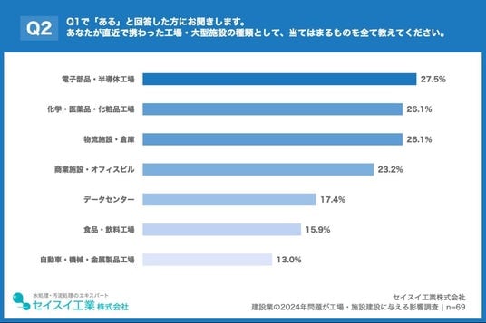 「Q2. Q1で「ある」と回答した方にお聞きします。あなたが直近で携わった工場・大型施設の種類として、当てはまるものを全て教えてください。(複数回答)」(n=69)と質問したところ、「電子部品・半導体工場」が27.5%、「化学・医薬品・化粧品工場」が26.1%、「物流施設・倉庫」が26.1%という回答となりました。