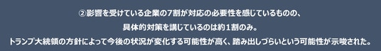 またトランプ関税の影響を受けている内容があると回答した企業のうち、その対応の必要性を感じている企業は約7割に上りましたが、対策の必要性を感じている企業のうち、実際に対策を講じている企業は14.2%にとどまっていることが明らかになりました。